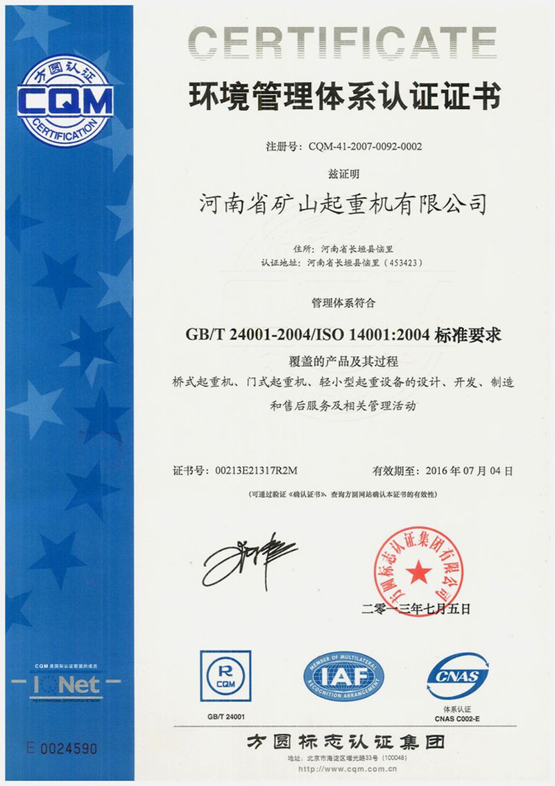 環境管理體系認證證書