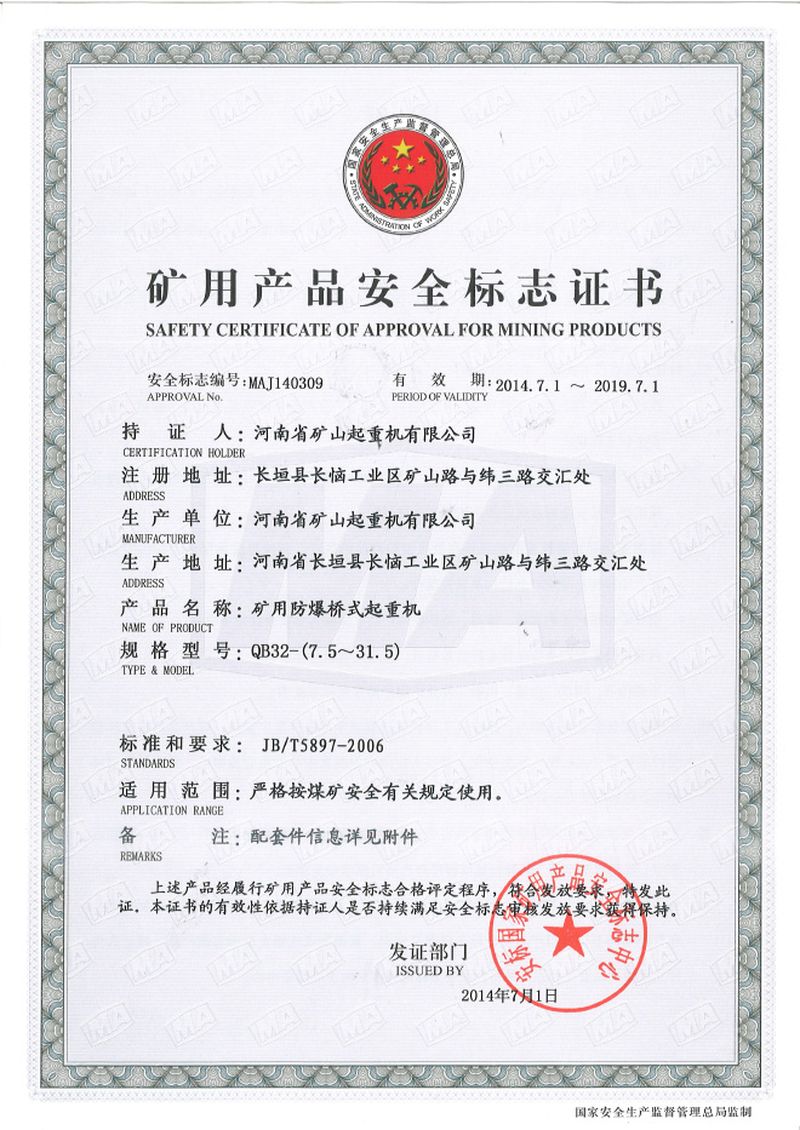 礦用產品安全標志證書