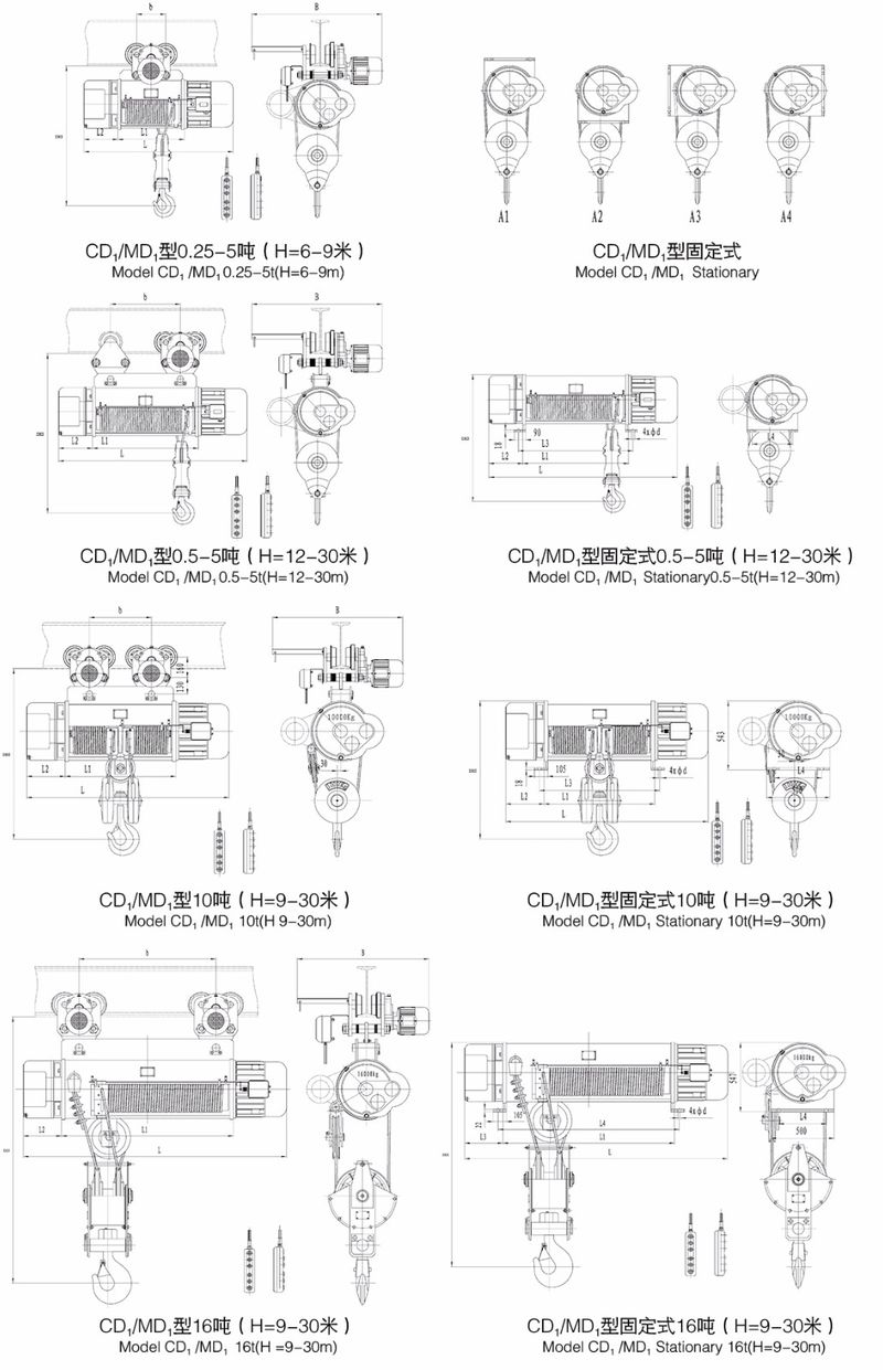 CD1型,MD1型鋼絲繩電動葫蘆是一種輕小型起重設備。它可以安裝在葫蘆單梁,橋式起重機,門式起重機,懸臂起重機上。稍加改動,還可作卷揚用。因此,它是工廠、礦山、港口、倉庫、貨場、商店等常用的起重設備之一,是提高勞動效率,改善勞動條件的必備機械。