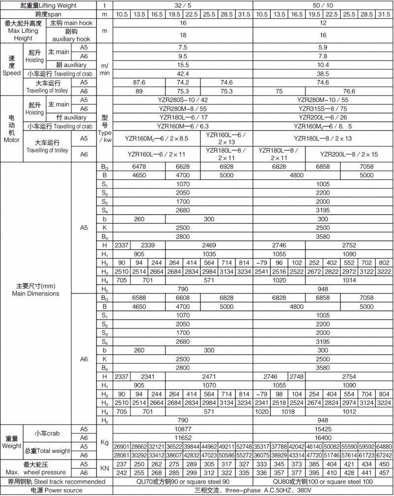 QD型5~50/10噸吊鉤橋式起重機
