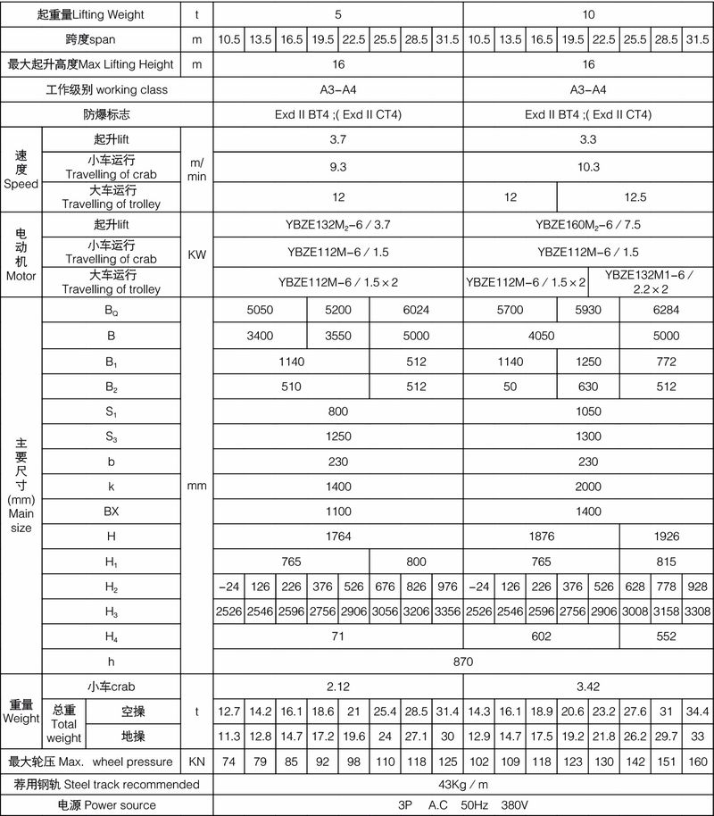 QB型防爆橋式起重機所有電機、電器防爆性能符合GB3836.2-2000《爆炸性氣體環境用電氣設備第2部分:隔爆型“d”》、整機性能符合JB/T5897-2006《防爆橋式起重機》標準之規定,經國家指定的防爆產品檢驗單位檢驗合格,取得了《防爆合格證》。防爆標志分別為ExdII BT4、Exd II CT4。